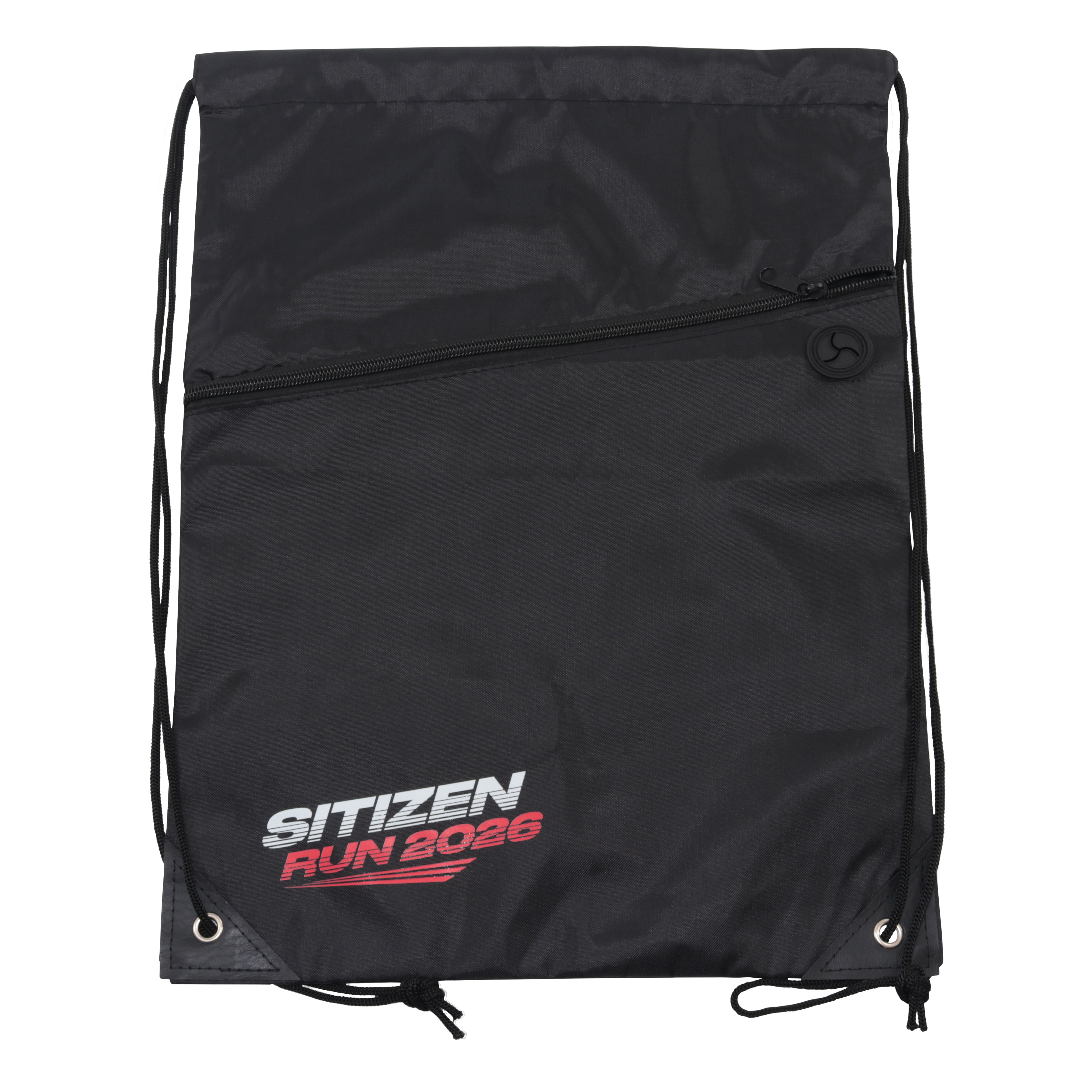 Large main compartment with drawstring rope closure. Zippered front pocket with earbud port. Reinforced corner tabs. Earbuds not included.