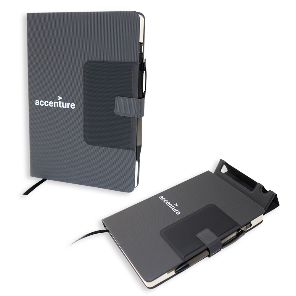 By blending the past with the future, this high quality hardcover notebook features an integrated cardholder, integrated pen compartment and a fold out stand for your phone and a pen. Hence, creating the perfect mini workstation.