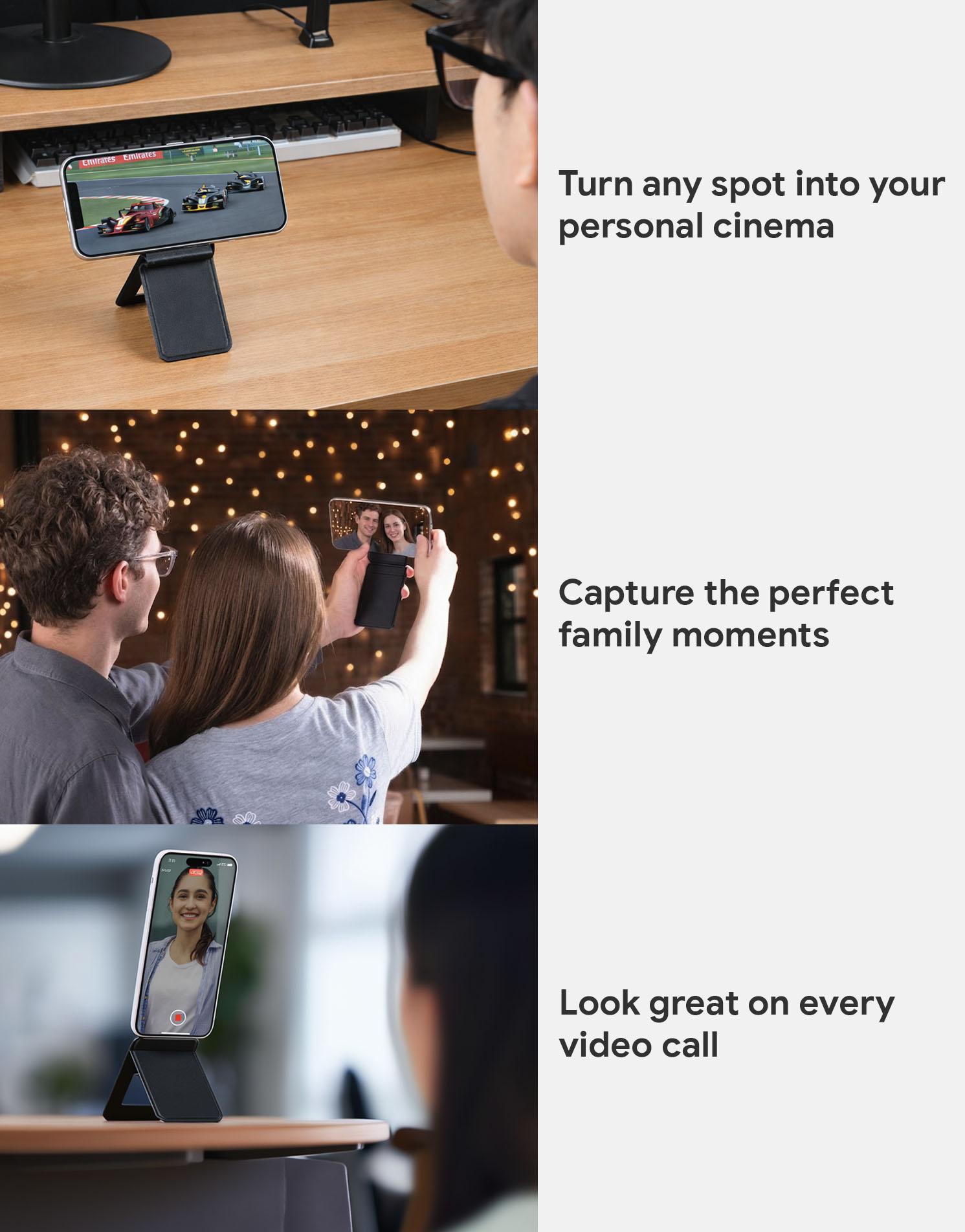 A versatile MagSafe-compatible accessory that combines a wallet, stand, and tripod in one sleek design.