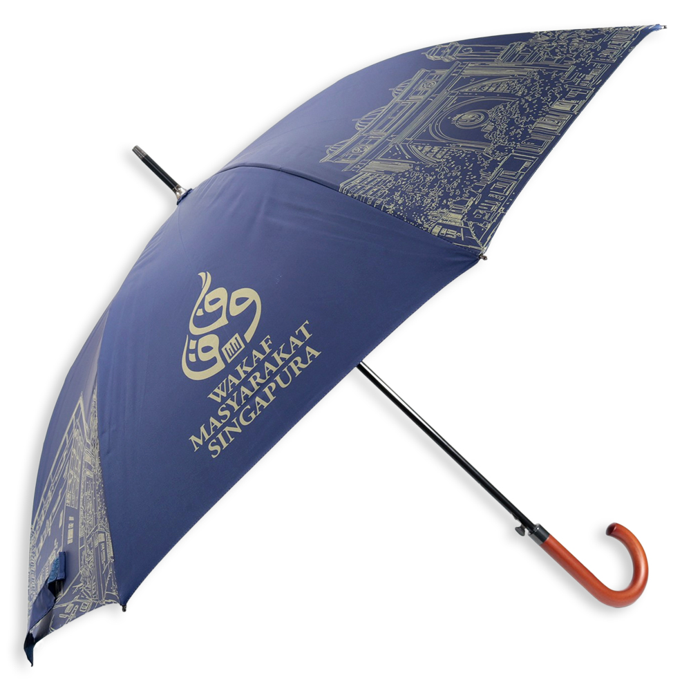 Featuring a stylish J-hook wooden handle and a robust fiberglass frame, this umbrella is built to withstand wind and rain.