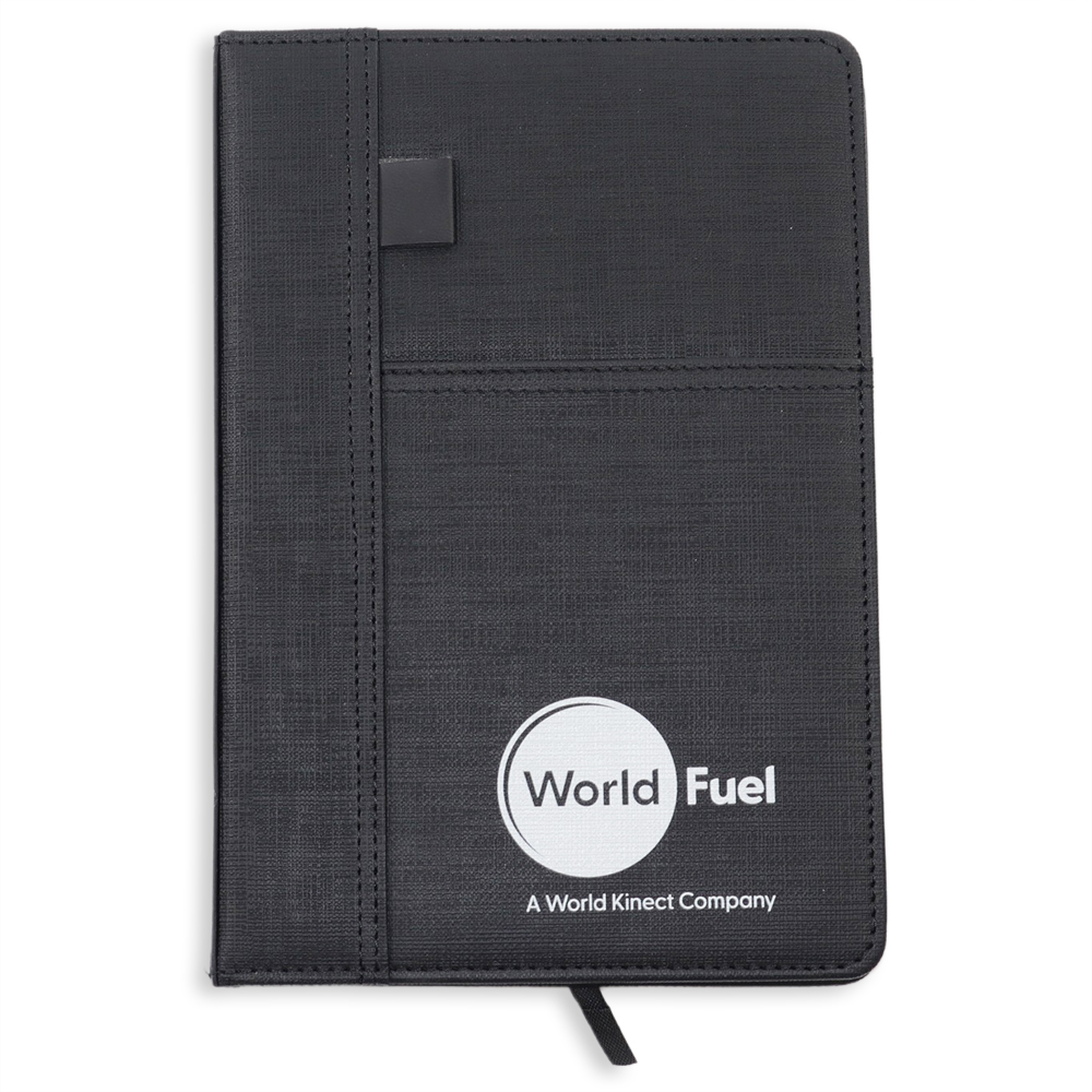 A sleek, textured A5 notebook with an integrated pen slot and outer pocket — tailored for professionals who need style and function in every meeting.