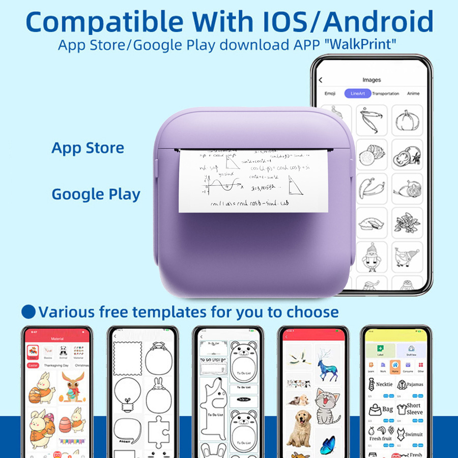 This compact mini thermal printer is designed for effortless on-the-go printing. Measuring just 85 × 80 × 30 mm and weighing only 150g, it fits easily into your pocket or bag, allowing you to print anytime, anywhere. The printer smartly recognises text, images, tables, emojis, QR codes, and more. Simply download the “Walk Print” app on the App Store or Google Play and follow the user manual for quick setup.