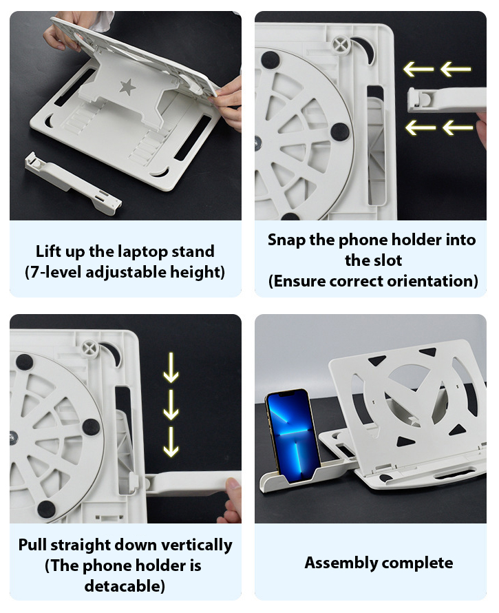 Built with a sturdy yet lightweight structure, it provides stable support for your laptop while remaining easy to carry and store. The integrated phone holder keeps your device within view, making multitasking, video calls, and message checking effortless without cluttering your desk.