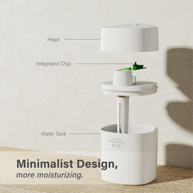 Compact 220ml humidifier that enhances air hydration and reduces dryness, perfect for desks, bedrooms, and small spaces.